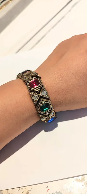 Pulsera MOGHUL vintage de estilo victoriano neorrenacentista con eslabones etruscos y cabujones de cristal checo. Pulsera años 70.